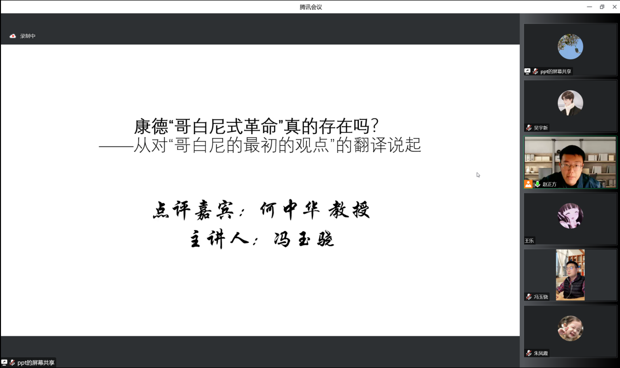 论坛伊始,冯玉骁对一个哲学专业的常识性问题——康德的哥白尼式革命进行了介绍,即惯常性地将其理解为“日心说”取代“地心说”。随后,他从哥白尼最初的观点出发,认为这种观点有穿凿附会之嫌,并由此展开后续的解释。其一,他回溯了康德的阐释背景;其二,他对康德使用的天文词汇本意做出了厘定与原文逻辑澄清;其三,他回溯了科学史概念中“哥白尼革命”的生成过程。由此得出,康德并无“日心”取代“地心”之类比的论述,并随之给出了原因。最后,冯玉骁做出主讲内容总结,哥白尼的最初观点同“地心”与“日心”之间的颠倒并无直接关联,也不等同于“哥白尼革命”,现有译文存在一定的误读。对于科学史的解释,我们应该探求每一个看似独立的事件背后相互交叉的经纬。