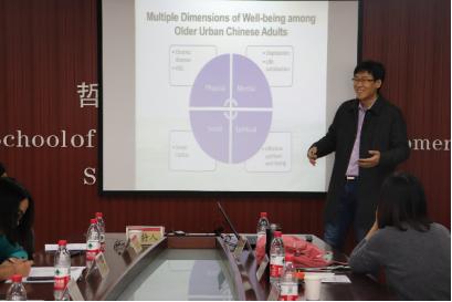 社会学系副教授王鹏,她分享的《养育子女如何影响人们的社会网络资源》从养育子女这一现实问题出发,以社会资本理论、性别角色理论、生命历程理论作为支撑,通过问卷数据的分析养育孩子对父母亲社会网络资源不同性别、不同阶段的影响。中国人民大学社会与人口学院吕楠副教授作了题为《Does Gender Moderate the Relationship Between Social Capital and Life Satisfiction?Evidence from Urban China》的报告,立足中国老龄化问题,关注老年人的社会资本、心理健康状态与生活幸福感,并通过建立数据分析模型研究家庭关系、社区支持两项关键的社会资本对社会撤离后老年人养老生活影响的性别差异。
