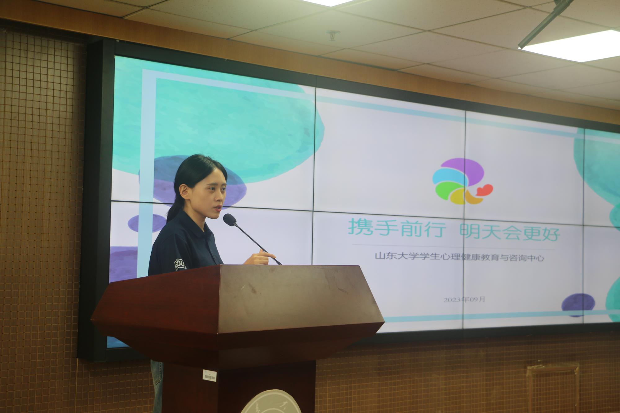 学生心理健康教育与咨询中心副主任刘倩倩、2023级新生辅导员封莹及2023级新生家长。