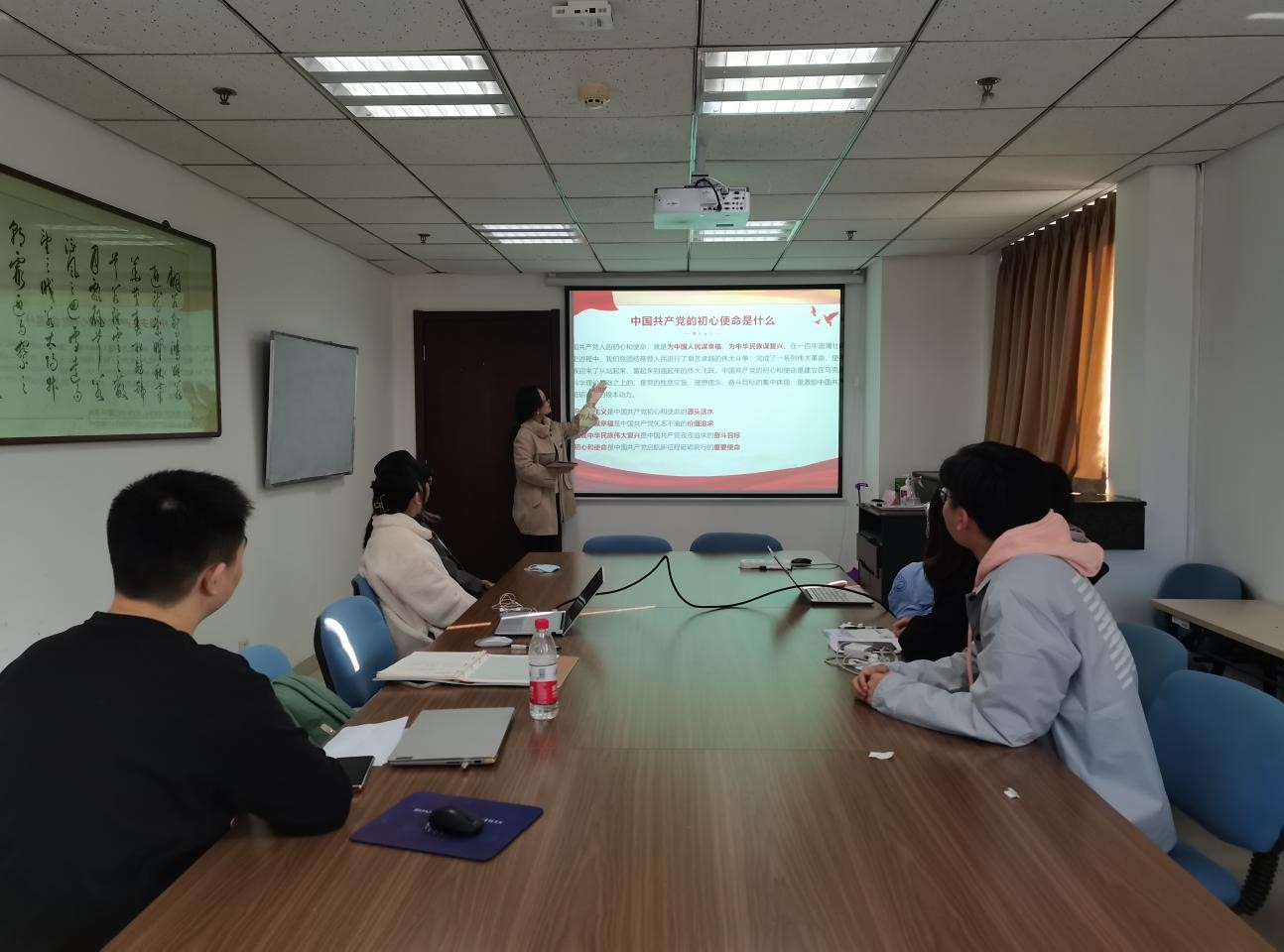 随后,牟绍宁从一颗初心、百年党史、十个坚持三个方面,带领同学们开展十九届六中全会精神学习主题团日活动。同学们纷纷表示,当今时代,国家面临着难得的历史机遇和一系列重大风险挑战,作为青年人要发扬勇立潮头、奋勇搏击的斗争精神,为国家富强贡献力量。