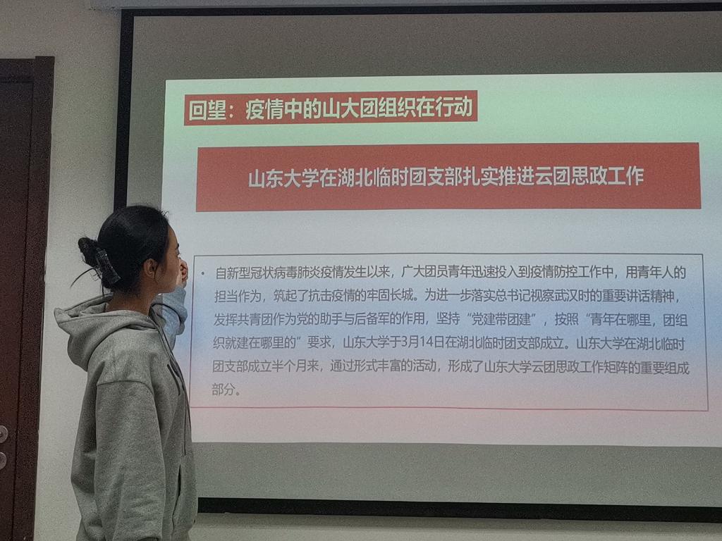 班会结束后,团支书屈雅楠主持团会。在会上,她声情并茂地讲解着共青团组织在抗疫过程中发挥的巨大作用,并回望了857直播