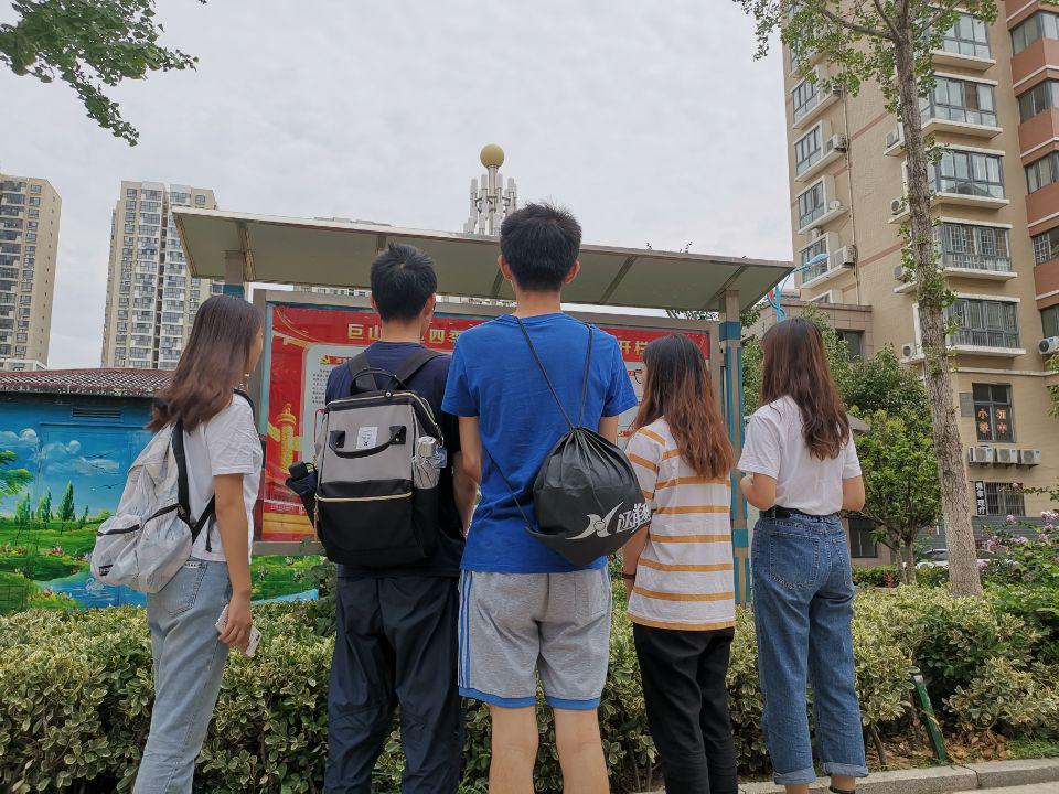 团队成员们在居住在四季菁华社区的一名团队成员的沟通下,与社区工作人员约定进行调研与访谈。一进入小区,成员们就仔细观看了小区的宣传栏,对四季菁华小区的情况有了大概的了解。